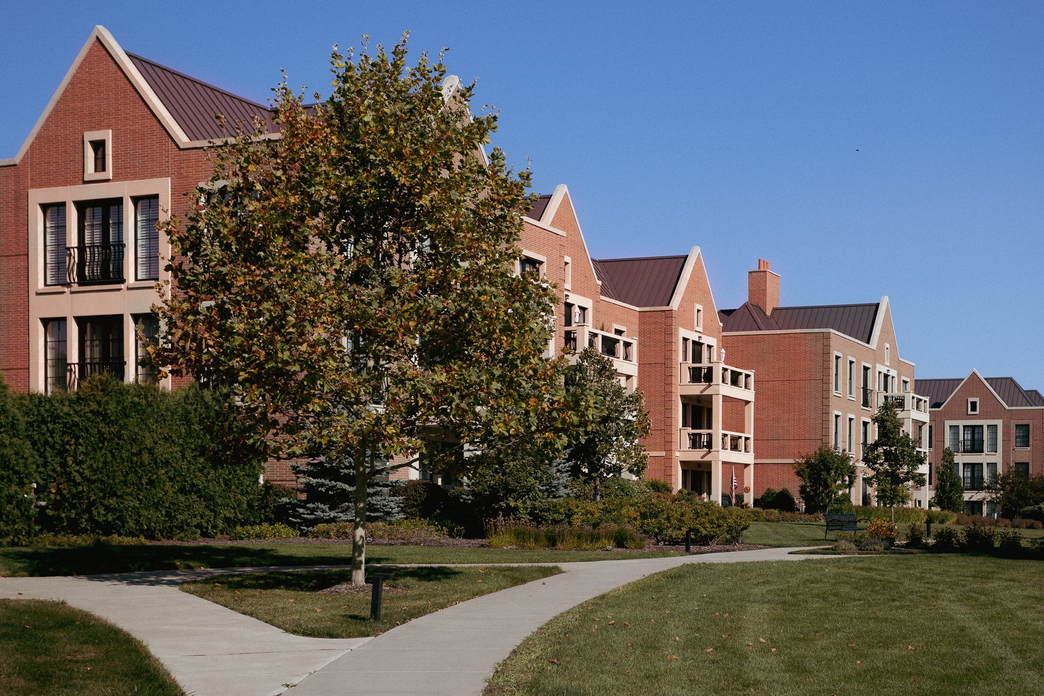 Kelmscott Park is a thoughtfully planned mixed-use residential development near the Central Business District of Lake Forest, Illinois. Redeveloped on the former City of Lake Forest Public Works site, the project transformed municipal land into a vibrant, walkable neighborhood that supports the city's long-term vision for downtown reinvestment. The development delivers 164 residential units, including three apartment buildings with 110 luxury apartments and underground parking, two condominium buildings with 42 residences with underground parking, and 12 single-family homes. This diverse mix of housing types creates a balanced residential community while remaining fully compatible with the architectural character and scale of Lake Forest. The project incorporates underground parking structures to support residential density while minimizing visual impacts and enhancing the pedestrian experience. A prominent corner of the site was preserved as public open space—now known as Franklin Park—providing a meaningful community amenity and reinforcing the project's commitment to placemaking. The project also preserved a majestic 54" swamp white oak dating back to prior to the incorporation of the City of Lake Forest in 1860. With direct access to downtown amenities, transit, and local services, Kelmscott Park exemplifies successful urban infill redevelopment. The final condominium phase was completed in 2025, marking the full realization of a carefully phased, mixed-use neighborhood that strengthens the fabric of downtown Lake Forest.